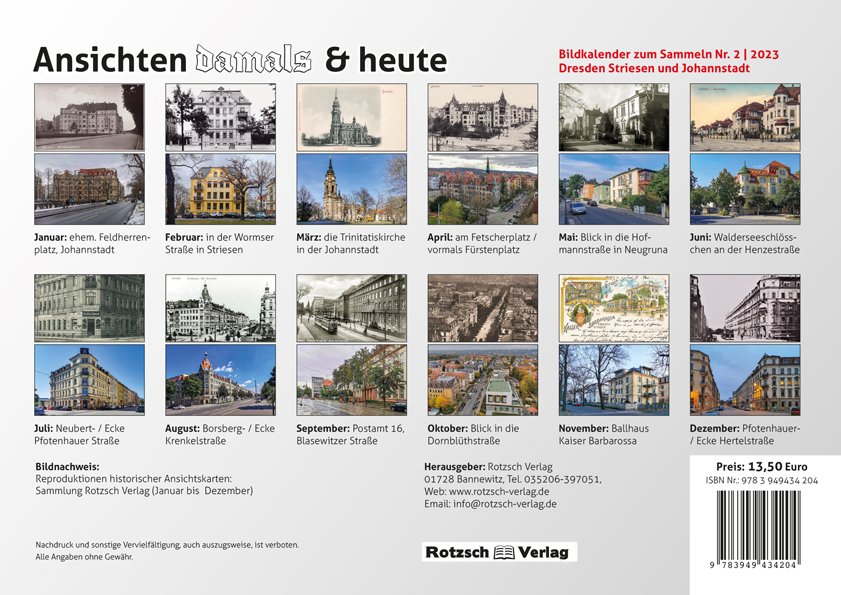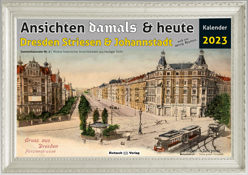 Bildkalender 2023 – historische Motive der Dresdner Stadtteile Striesen & Johannstadt und die heutige Sicht.