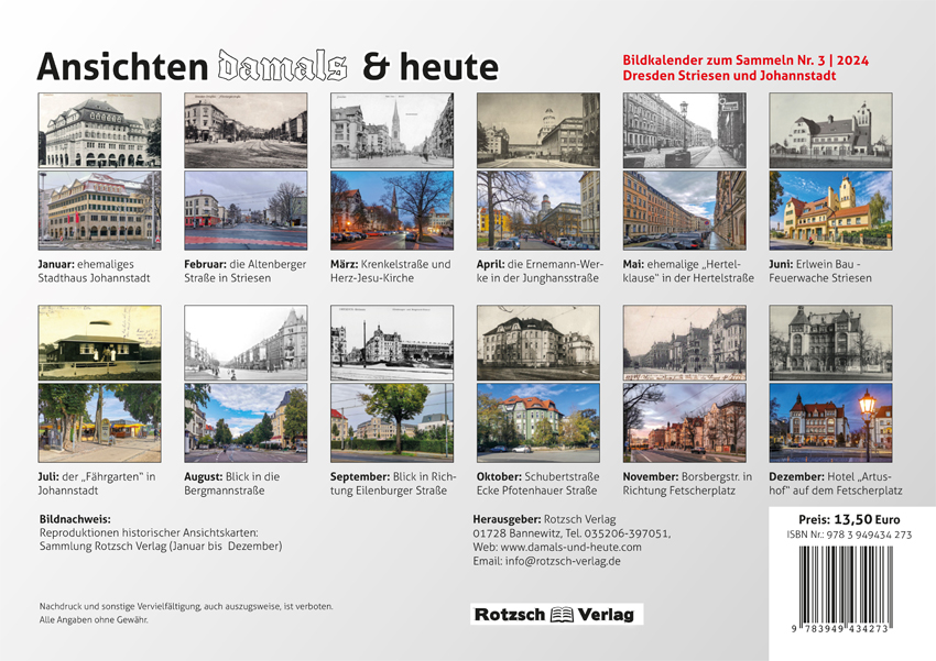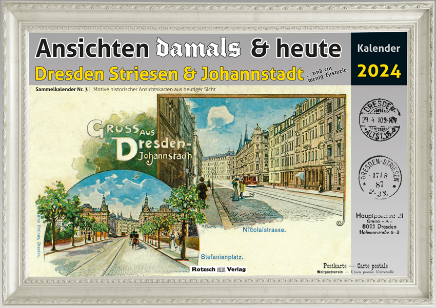 Bildkalender 2024 – historische Motive der Dresdner Stadtteile Striesen & Johannstadt und die heutige Sicht.