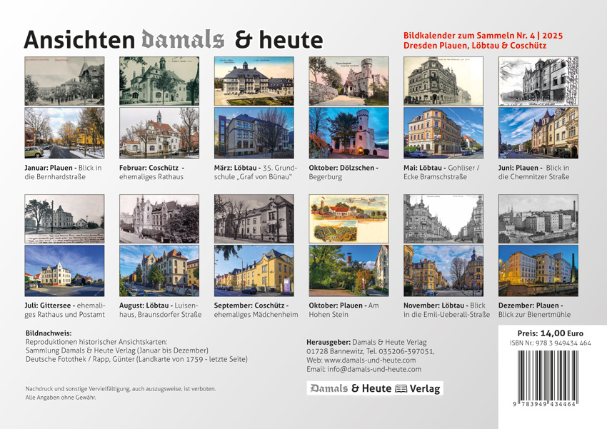 Bildkalender 2025 – historische Motive der Dresdner Stadtteile Plauen, Löbtau und Coschütz und die heutige Sicht.